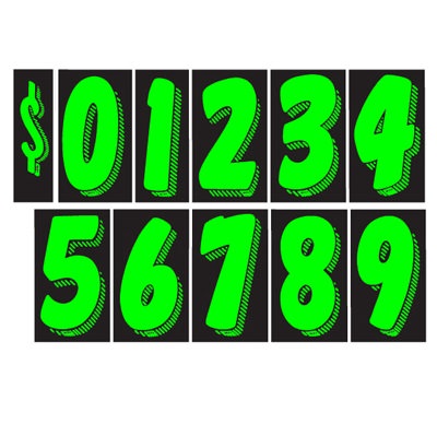 A larger version of The ORIGINAL Fluorescent Chartreuse, 3-D shaded design, adhesive windshield number. An inexpensive yet highly effective sales tool to advertise a year model or price. Sold by the dozen {12 per pack}. Size: 11 1/2″ tall x 7″ wide. Neatly shrink wrapped in packs of a dozen with a chipboard backer to prevent curling during storage. Made of durable, waterproof vinyl, these bright, fluorescent numbers demand attention! Each number is slit on the back for easy application. Removable adhesive allows easy, clean removal.