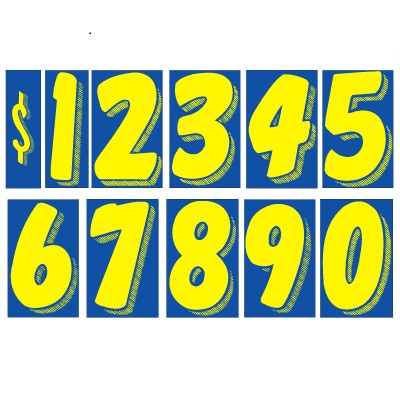 Blue & Yellow, 3-D shaded design, adhesive windshield number. An inexpensive yet highly effective sales tool to advertise a year model or price. Sold by the dozen {12 per pack}. Size: 7 1/2″ tall x 4″ wide. Neatly shrink wrapped in packs of a dozen with a chipboard backer to prevent curling during storage. Made of durable, waterproof vinyl, these bright, non-fade numbers demand attention! Each number is slit on the back for easy application. Removable adhesive allows easy, clean removal. Please note these adhesive numbers are not reusable.