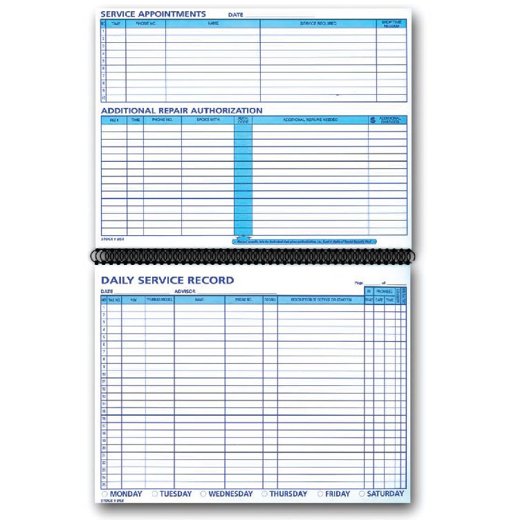 Daily Service Record Book coil bound book is an excellent way to track repairs for appointments, authorizing additional repairs and having a record of both. Compact and complete.