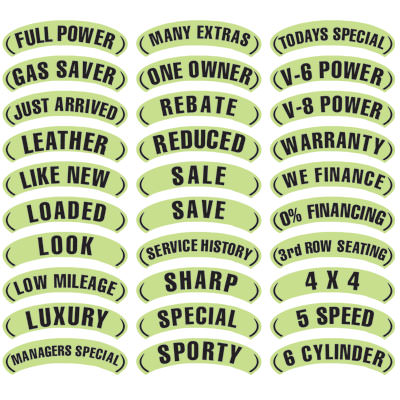 The Perfect Compliment to our Oval Year Model Signs! Made with non-fade inks, these windshield decals are specially designed to work with our Oval Signs. Use an Arch Slogan over an Oval Sign to emphasize a feature in addition to the year model or use alone, without an Oval Year Model Sign for a great new look. Use multiple Arch Slogans for a layered appearance. Made of waterproof vinyl with a removable adhesive. Each Arch Slogan is approximately 2.75 inches tall x 14 inches long. Sold in neatly shrink wrapped packs of 12.