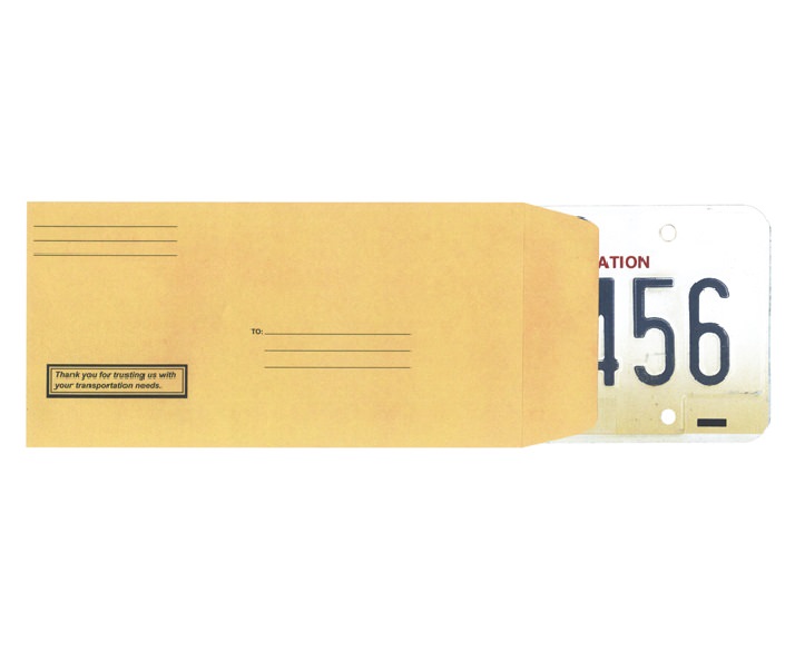 These thick stock, preprinted as shown, envelopes make getting state plates to customers a snap. Self seal closure and ready to address. 100 per package