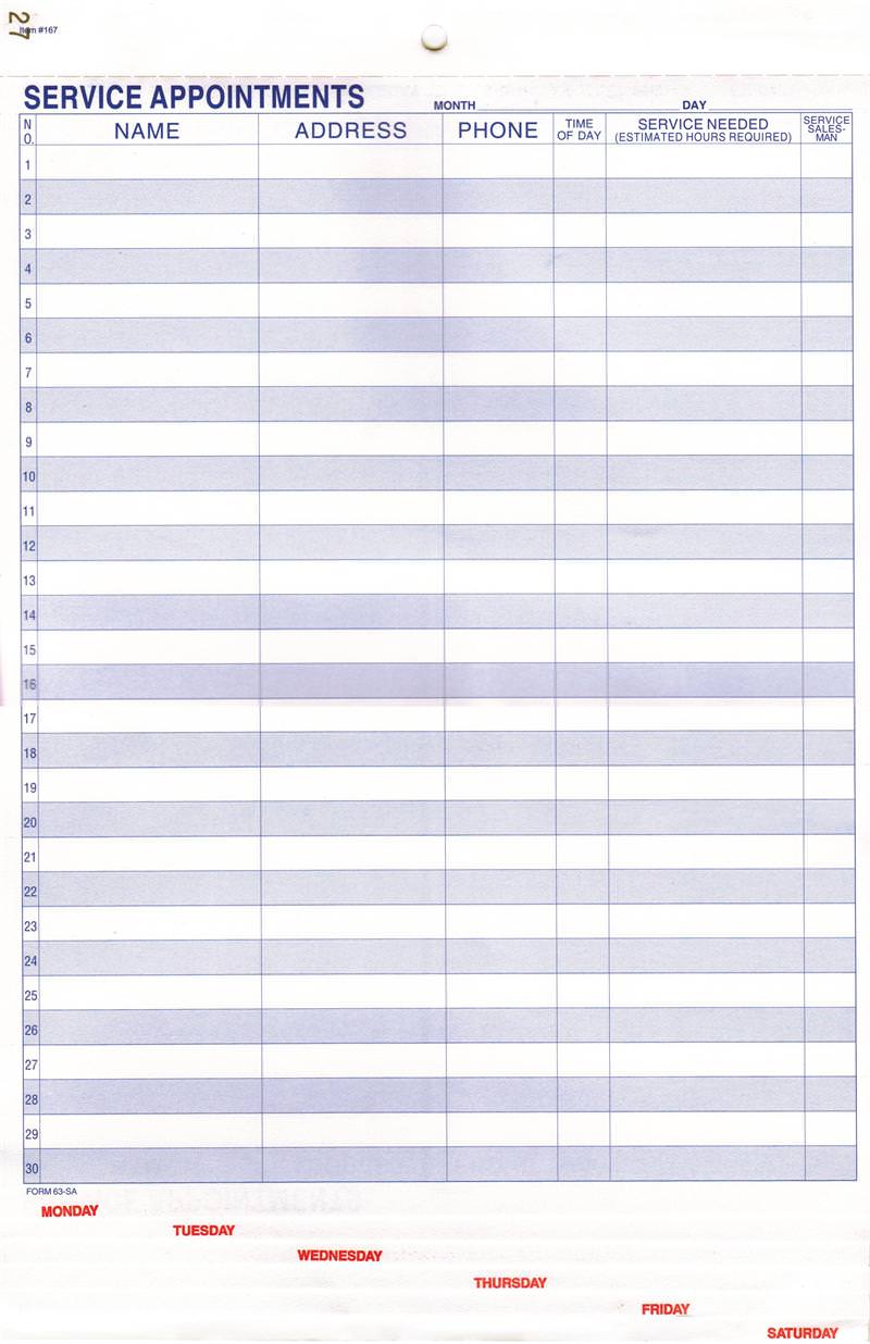 Service Appointment pages are an easy way to organize and schedule daily work. Each sheet is identified from Monday through Saturday. 30 lines per side, 60 lines per day total.
