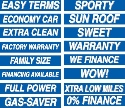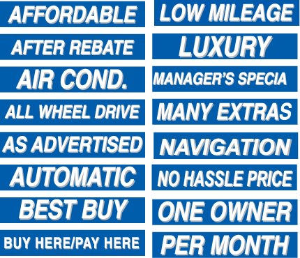Bright Blue & White, 3-D shaded design, adhesive windshield sign. An inexpensive yet highly effective sales tool to advertise a feature or selling point! Sold by the dozen {12 per pack}. Size: 15″ long x 2 3/4″ tall. Neatly shrink wrapped in packs of a dozen with a chipboard backer to prevent curling during storage. Made of durable, waterproof vinyl, these bright, non-fade signs demand attention! Each sign is slit on the back for easy application. Removable adhesive allows easy, clean removal.