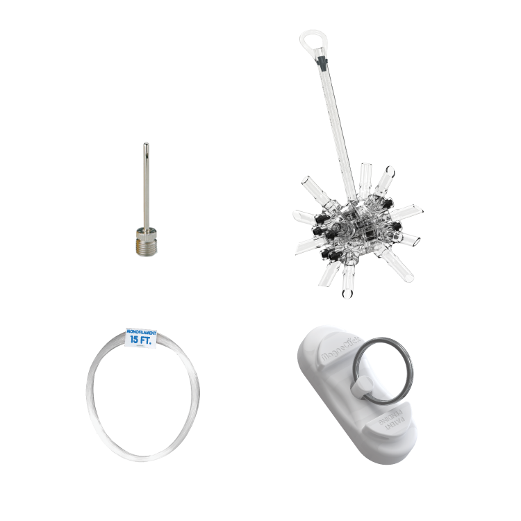 Includes: (12)12″ Plastic Balloons,(1) 12-Port Manifold,(1) 15′ Monofilament for hanging, (1) White 18lb- strength MagneClick® magnet, inflation needle and easy-to-understand installation instructions.