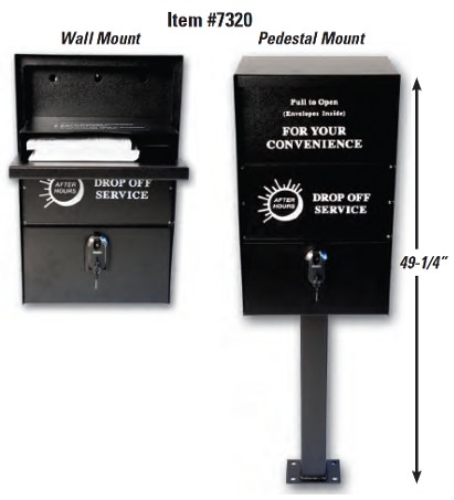 Absolutely the BEST Night Drop System Available. Wall Mount or Pedestal Mount. This system is completely self contained and secure. Durable steel box with pull-down door for customer convenience to fill out envelope.